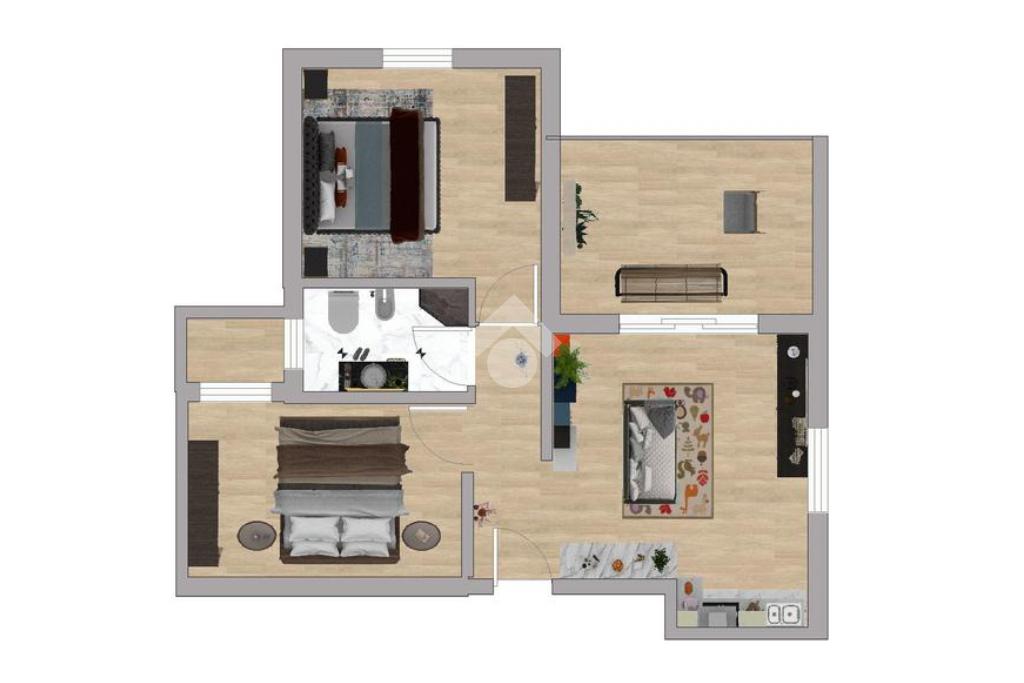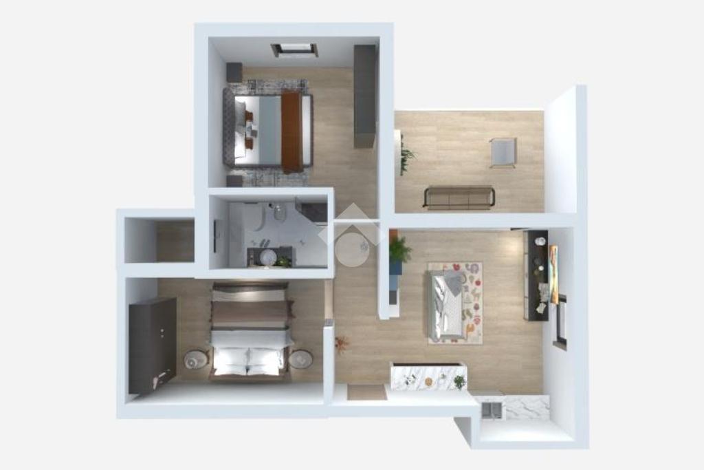 La zona notte ospita due spaziose camere matrimoniali, di cui una con accesso a un piccolo spazio esterno privato, ideale come zona lavanderia o angolo relax.