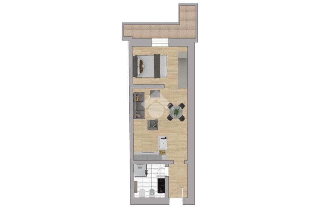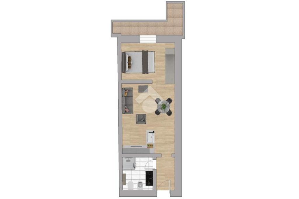 L’immobile si presenta ben organizzato negli spazi: entrando troviamo la zona cucina e il soggiorno, che è stato sapientemente diviso da un muretto creando una comoda zona notte più riservata, ideale per garantire maggiore privacy pur mantenendo la funzionalità tipica di un monolocale. Una porta finestra conduce al balcone, perfetto per godersi momenti di relax all’aria aperta.