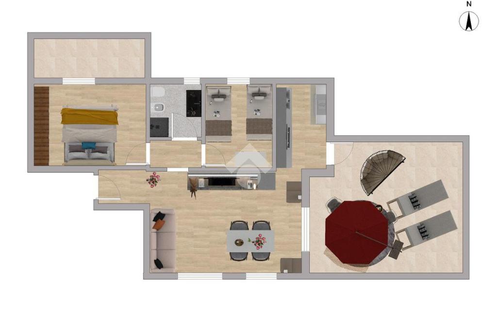 L’appartamento si distingue per una distribuzione degli spazi funzionale e accogliente: l’ingresso conduce a un soggiorno ben organizzato con cucina a vista separata, ideale per vivere al meglio la zona giorno. La zona notte comprende una camera matrimoniale, una camera doppia e un bagno finestrato completo di doccia.